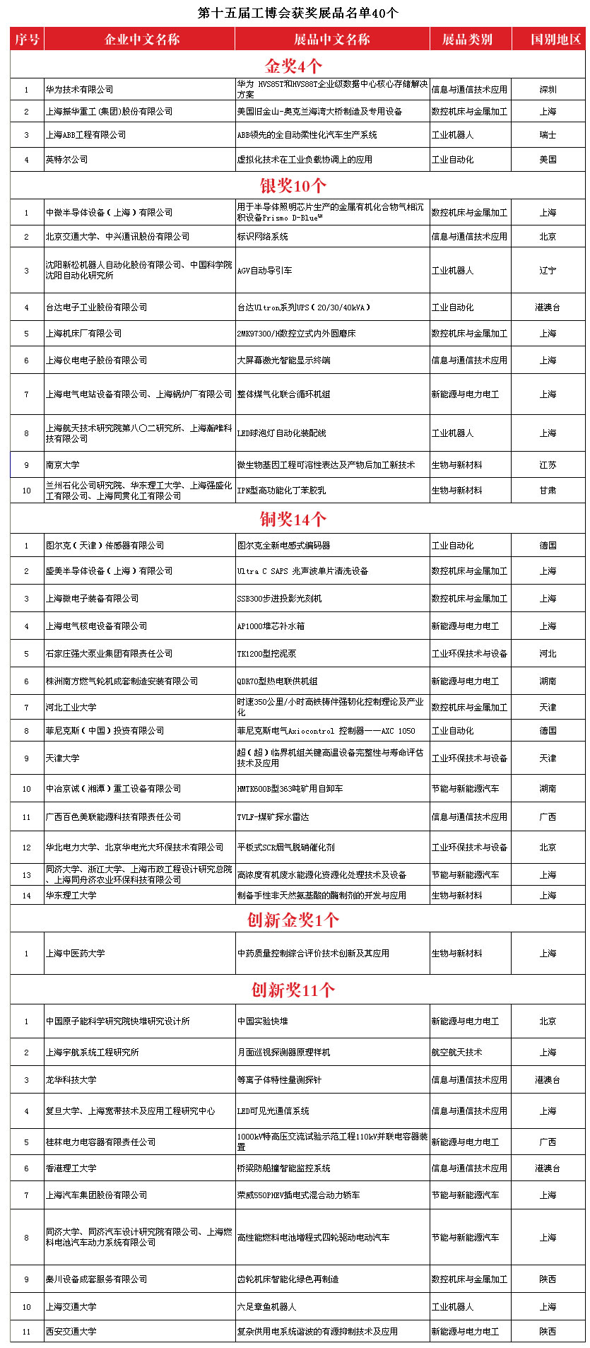 11月7日下午,第十五屆中國(guó)國(guó)際工業(yè)博覽會(huì)獲獎(jiǎng)?wù)蛊吩u(píng)選結(jié)果在N3館特設(shè)的評(píng)獎(jiǎng)?wù)故緟^(qū)揭曉。4項(xiàng)金獎(jiǎng)、10項(xiàng)銀獎(jiǎng)、14項(xiàng)銅獎(jiǎng)、1項(xiàng)創(chuàng)新金獎(jiǎng)、11項(xiàng)創(chuàng)新獎(jiǎng)等全部40項(xiàng)獲獎(jiǎng)產(chǎn)品從167家海內(nèi)外參展單位申報(bào)的217項(xiàng)參選產(chǎn)品中脫穎而出,斬獲榮譽(yù)。