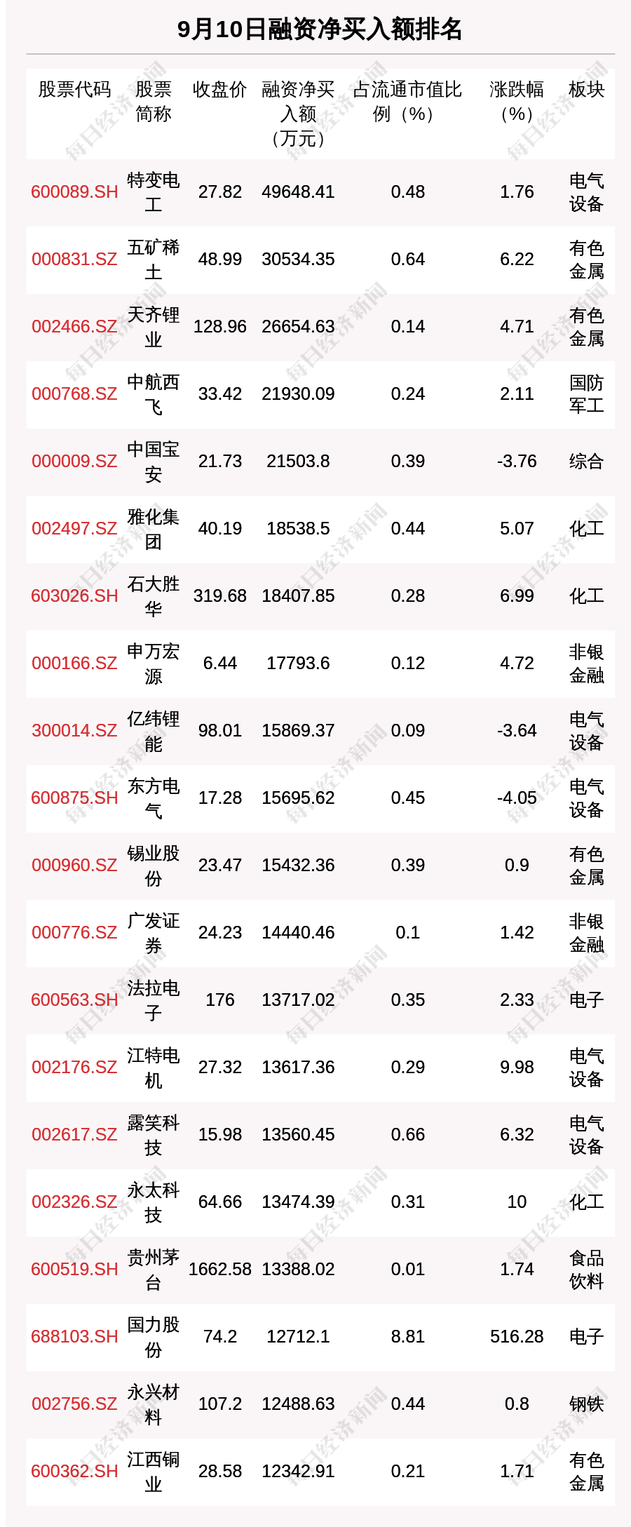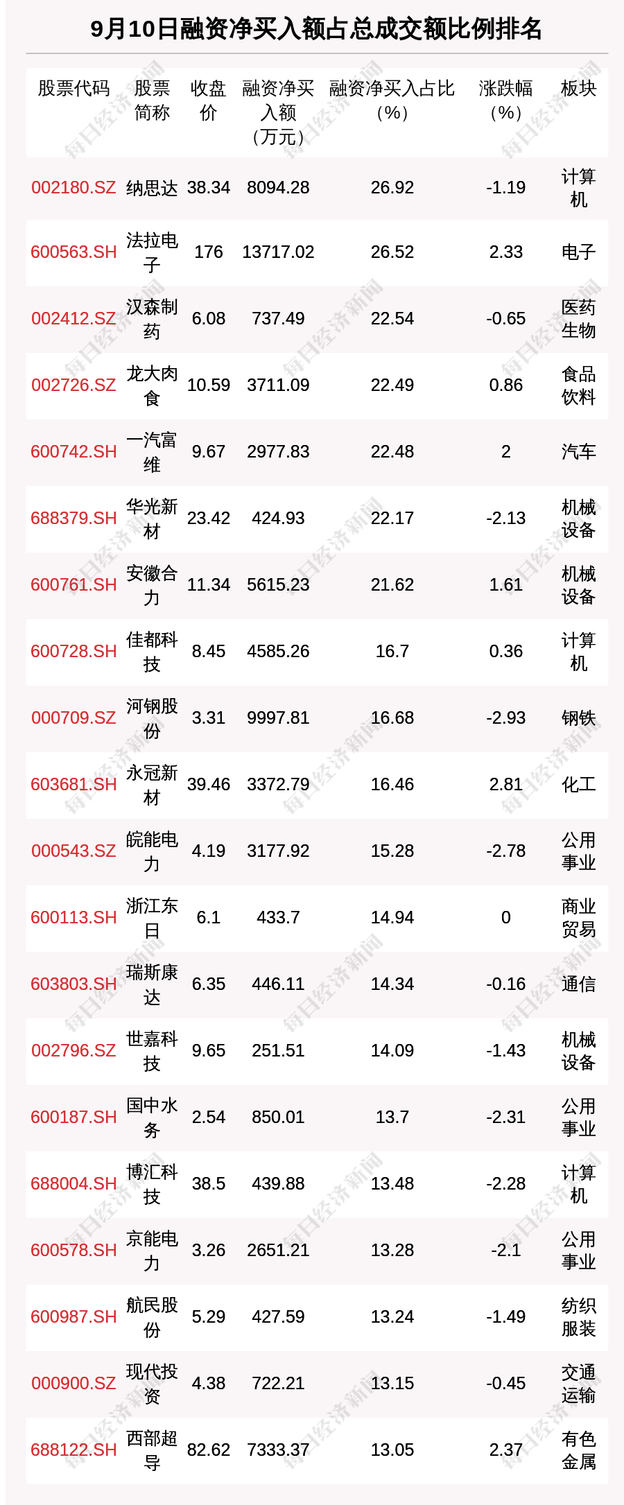 9月10日兩市共有981只個股有融資資金凈買入。共有38只股票融資凈買入額占總成交金額比例超10%,其中納思達、法拉電子、漢森制藥排名前三,占比分別為26.92%、26.52%、22.54%。