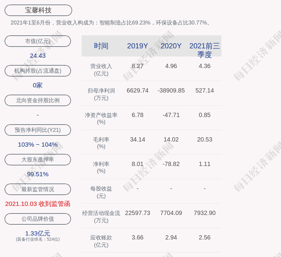 2021年1至6月份,寶馨科技的營業(yè)收入構(gòu)成為:智能制造占比69.23%,環(huán)保設備占比30.77%。