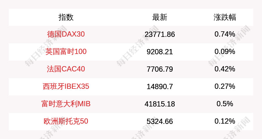 每經(jīng)AI快訊:北京時(shí)間9月8日15:00,德國(guó)DAX30指數(shù)開(kāi)盤上漲174.88點(diǎn),漲幅為0.74%,報(bào)23771.86點(diǎn);英國(guó)富時(shí)100指數(shù)開(kāi)盤上漲7.99點(diǎn),漲幅為0.09%,報(bào)9216.2點(diǎn);法國(guó)CAC40指數(shù)開(kāi)盤上漲32.01點(diǎn),漲幅為0.42%,報(bào)7706.79點(diǎn);西班牙IBEX35指數(shù)開(kāi)盤上漲39.8點(diǎn),漲幅為0.27%,報(bào)14890.7點(diǎn);富時(shí)意大利MIB指數(shù)開(kāi)盤上漲207.37點(diǎn),漲幅為0.5%,報(bào)41815.18點(diǎn);歐洲斯托克50指數(shù)開(kāi)盤上漲6.51點(diǎn),漲幅為0.12%,報(bào)5324.66點(diǎn)。