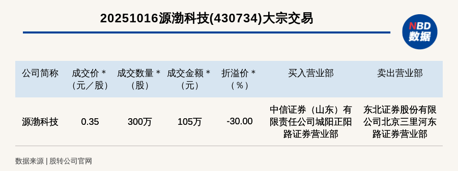 每經(jīng)訊,2025年10月16日,新三板基礎(chǔ)層公司源渤科技(430734,收盤價(jià):0.5元)發(fā)生一筆大宗交易,成交價(jià)0.35元/股,成交數(shù)量300萬(wàn)股,成交金額105萬(wàn)元,折價(jià)30%。買入營(yíng)業(yè)部是中信證券(山東)有限責(zé)任公司城陽(yáng)正陽(yáng)路證券營(yíng)業(yè)部,賣出營(yíng)業(yè)部是東北證券股份有限公司北京三里河?xùn)|路證券營(yíng)業(yè)部。