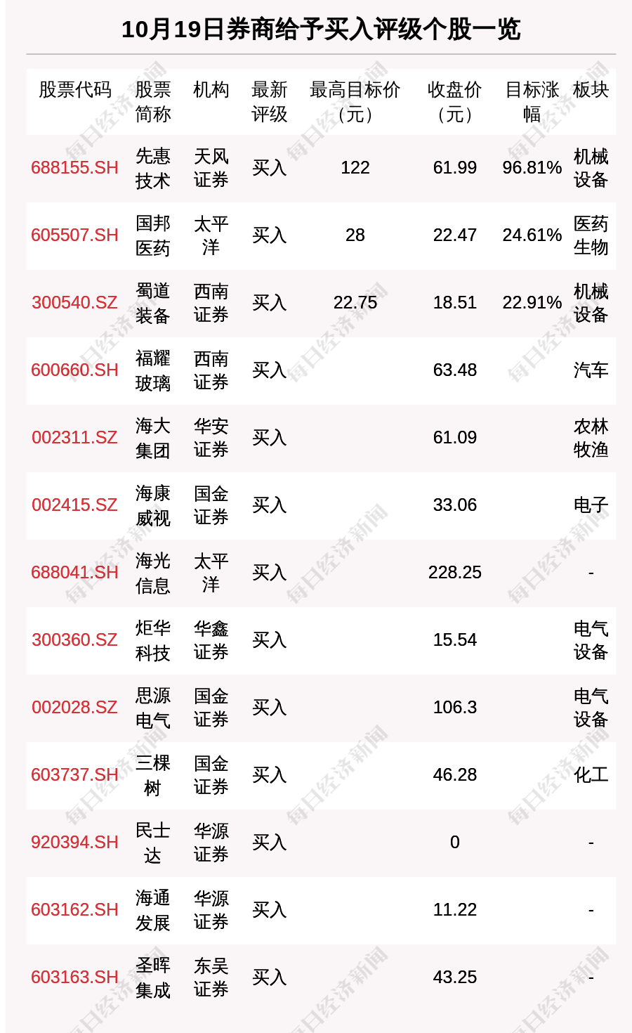 每經(jīng)AI快訊,10月19日,券商給予評(píng)級(jí)的個(gè)股數(shù)共有16只,獲得買入評(píng)級(jí)的個(gè)股數(shù)共有13只。在公布了目標(biāo)價(jià)格的3只個(gè)股中,按照最新收盤價(jià)計(jì)算,預(yù)期漲幅排名居前的個(gè)股是先惠技術(shù)(688155.SH)、國邦醫(yī)藥(605507.SH)、蜀道裝備(300540.SZ),預(yù)期漲幅分別是96.81%、24.61%、22.91%。