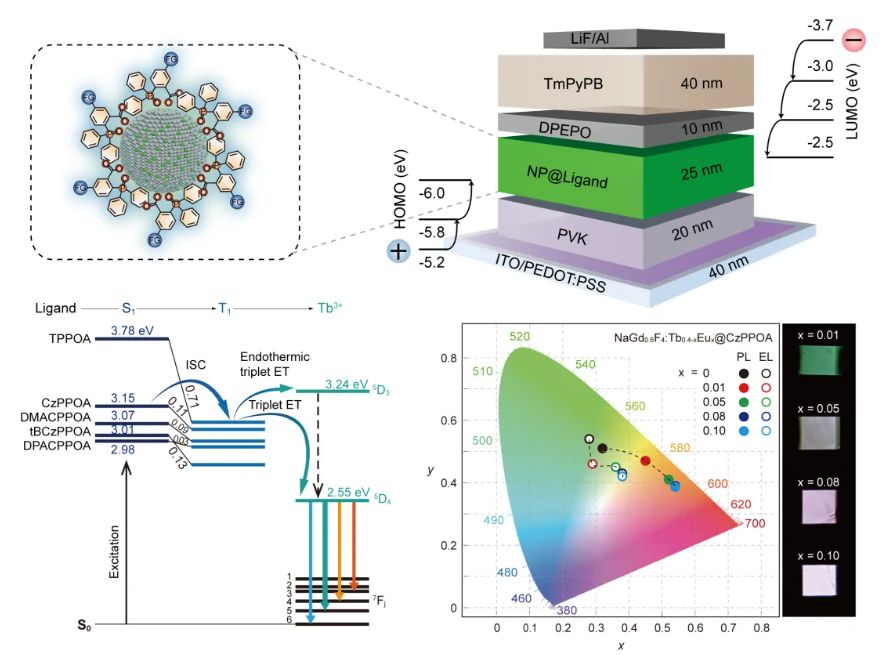 面對(duì)這一制約稀土材料邁向高端應(yīng)用的瓶頸,研究團(tuán)隊(duì)開(kāi)創(chuàng)性地提出有機(jī)半導(dǎo)體敏化策略,以功能化有機(jī)配體作為“光電橋梁”,成功將能量精準(zhǔn)高效地傳遞給絕緣稀土納米晶,實(shí)現(xiàn)了電流驅(qū)動(dòng)下的高效發(fā)光。