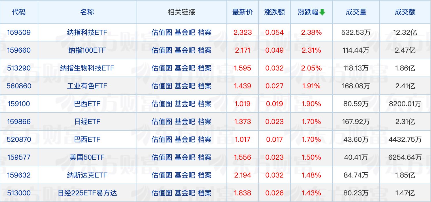 具體來看,納指科技ETF、納指100ETF、納指生物科技ETF漲幅均超過2%,工業(yè)有色ETF、巴西ETF也有所表現(xiàn)。