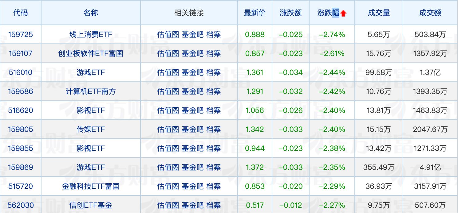 下跌方面,線上消費ETF領跌超2%,游戲ETF、影視ETF延續(xù)回調(diào)。