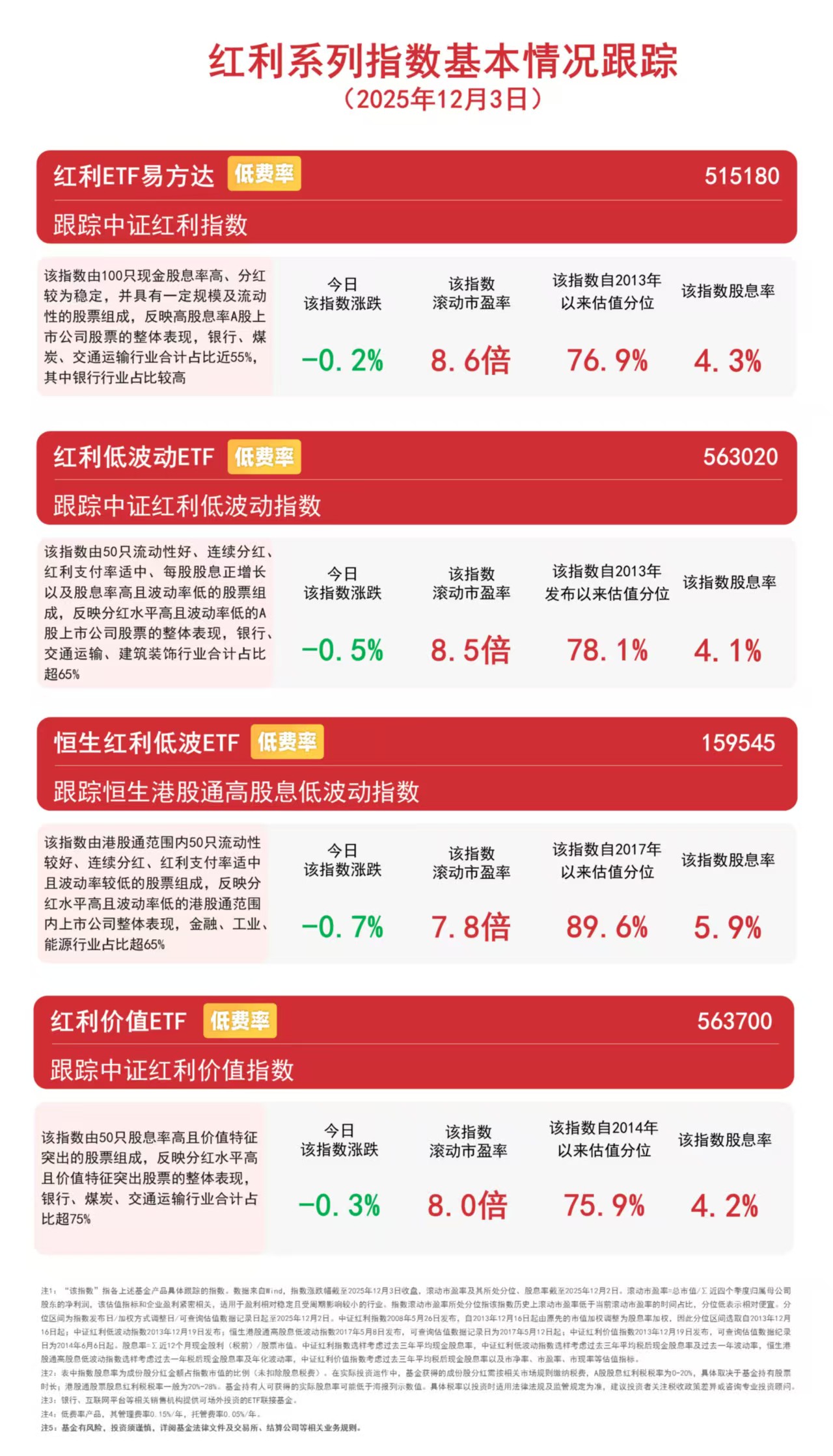 據(jù)悉,易方達(dá)基金是目前唯一一家紅利類(lèi)ETF全部實(shí)行低費(fèi)率的基金公司,旗下恒生紅利低波ETF(159545)、紅利ETF易方達(dá)(515180)、紅利低波動(dòng)ETF(563020)、紅利價(jià)值ETF(563700)、A500紅利低波ETF(563510)等產(chǎn)品的管理費(fèi)率均為0.15%/年,可助力投資者低成本布局高股息資產(chǎn)。