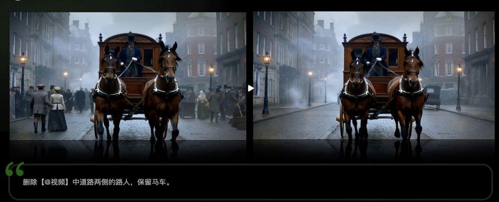 比如,在輸入?yún)^(qū)輸入“刪除【視頻】中道路兩側(cè)的路人,保留馬車”,修改后的視頻保持了主體的一致性,對被刪除的內(nèi)容進行了相對干凈的抹除。