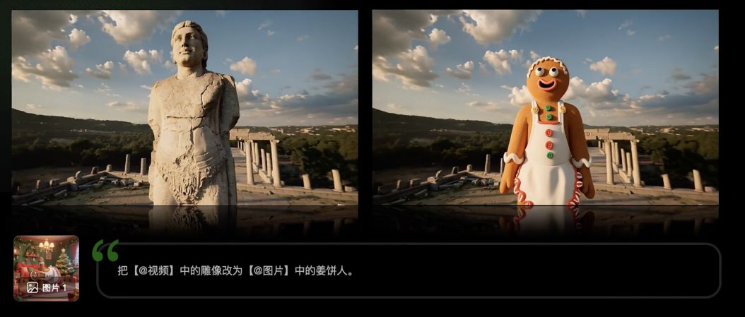 除了用文字指令刪除、增加內(nèi)容外,還可以用圖片指令修改視頻的主體等。比如,輸入“將【視頻】中的雕像修改為【圖片】中的姜餅人”,生成的視頻保持了原視頻的運鏡邏輯、背景一致,主體也按要求進行了替換。