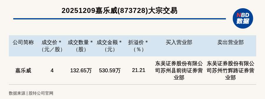 每經(jīng)訊,2025年12月9日,新三板基礎(chǔ)層公司嘉樂威(873728,收盤價(jià):3.3元)發(fā)生一筆大宗交易,成交價(jià)4元/股,成交數(shù)量132.65萬股,成交金額530.59萬元,溢價(jià)21.21%。買入營業(yè)部是東吳證券股份有限公司蘇州縣前街證券營業(yè)部,賣出營業(yè)部是東吳證券股份有限公司蘇州竹輝路證券營業(yè)部。