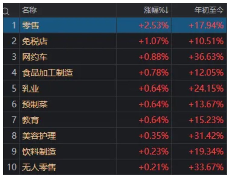 板塊方面,零售、乳業(yè)等板塊漲幅居前,貴金屬、影視院線、軍工、海南等板塊跌幅居前。