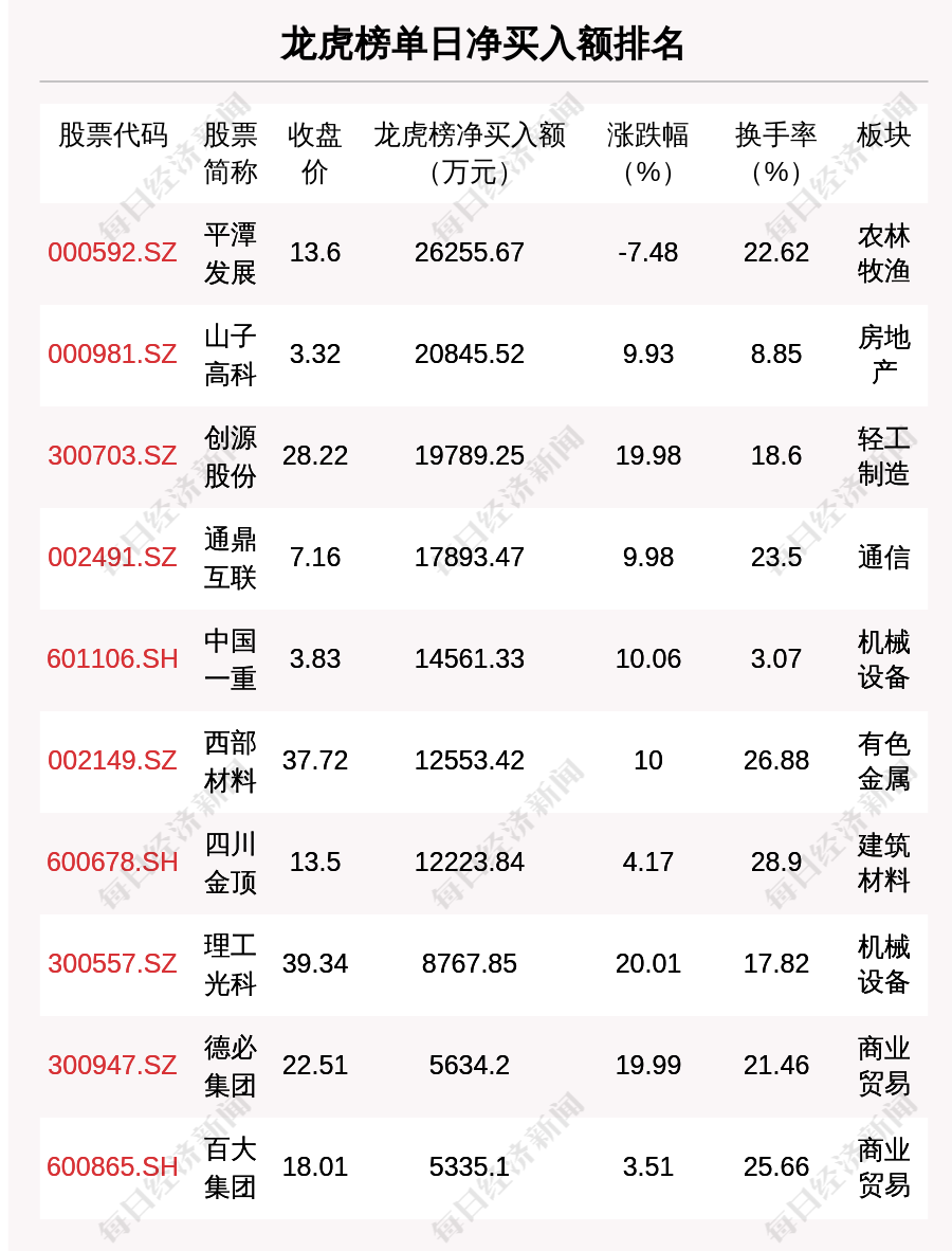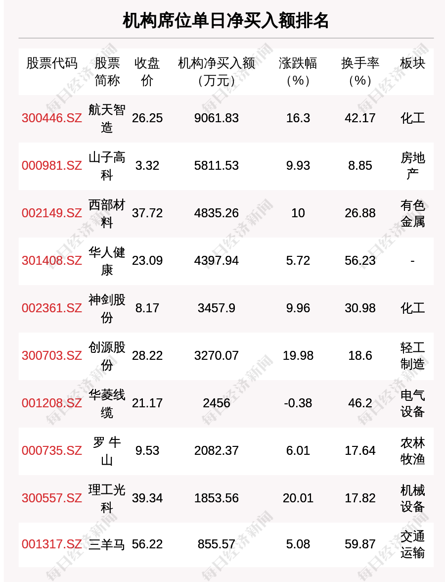在龍虎榜中,涉及機(jī)構(gòu)專用席位的個(gè)股有23只,凈買入額前三的是航天智造、山子高科、西部材料,分別為9061.83萬(wàn)元、5811.53萬(wàn)元、4835.26萬(wàn)元。