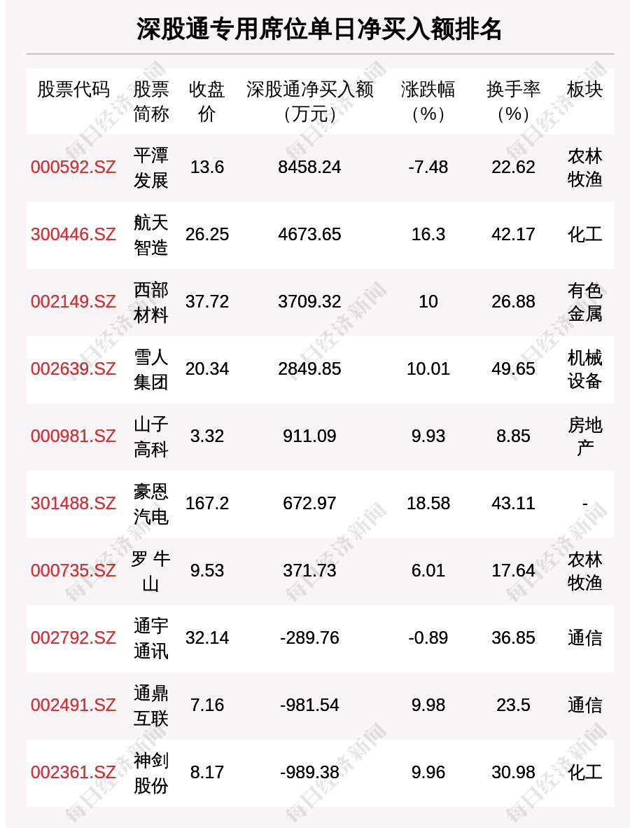 在龍虎榜中,涉及深股通專用席位的個(gè)股有13只,平潭發(fā)展的深股通專用席位凈買入額最大,凈買入8458.24萬(wàn)元。