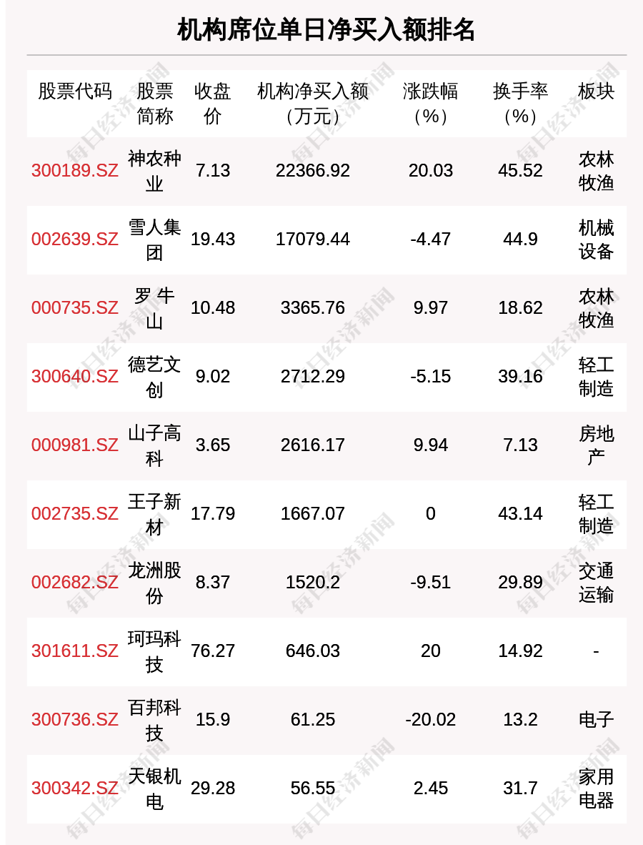 在龍虎榜中,涉及機(jī)構(gòu)專用席位的個(gè)股有21只,凈買入額前三的是神農(nóng)種業(yè)、雪人集團(tuán)、羅 牛 山,分別為2.24億元、1.71億元、3365.76萬(wàn)元。
