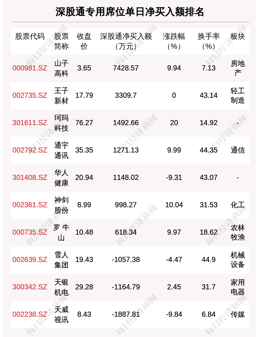 在龍虎榜中,涉及深股通專用席位的個(gè)股有12只,山子高科的深股通專用席位凈買入額最大,凈買入7428.57萬(wàn)元。
