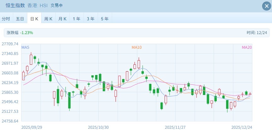今日(12月24日),港股市場迎來小幅高開,主要指數(shù)呈現(xiàn)微漲態(tài)勢,市場分化特征初顯。截至開盤,恒生指數(shù)上漲0.02%,報25780.09點;恒生科技指數(shù)漲幅稍高,上漲0.07%,報5492.83點。