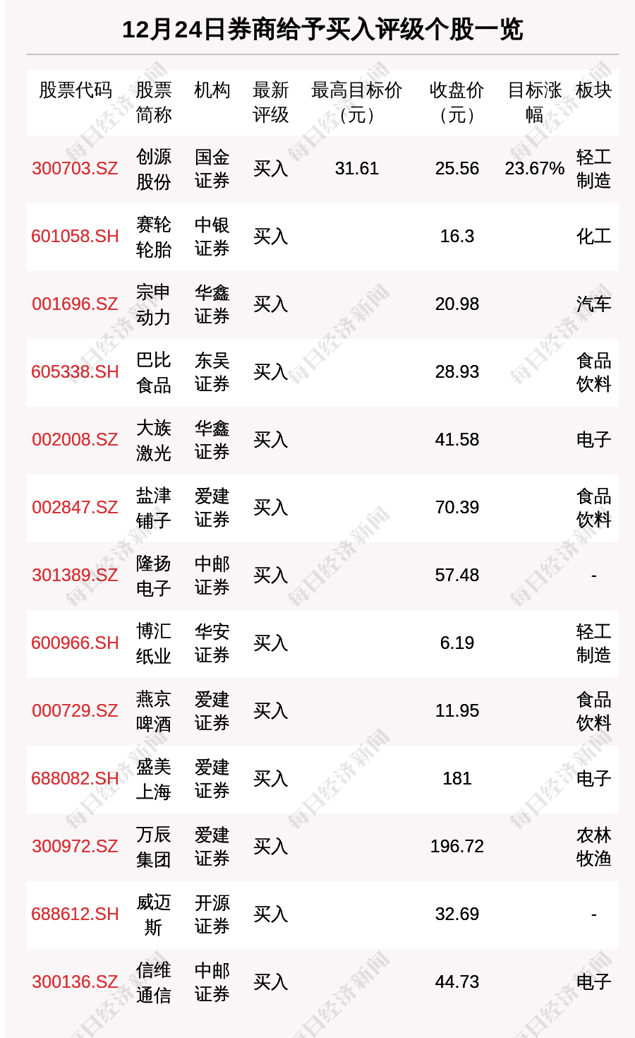 每經(jīng)AI快訊,12月24日,券商給予評級的個股數(shù)共有23只,獲得買入評級的個股數(shù)共有13只。在公布了目標(biāo)價格的1只個股中,創(chuàng)源股份(300703.SZ)預(yù)期漲幅是23.67%。