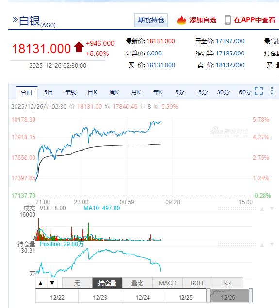 12月25日晚間,貴金屬期貨走強,截至12月26日凌晨2點30分收盤,白銀報18131元/千克,再創(chuàng)新高,漲幅5.50%。