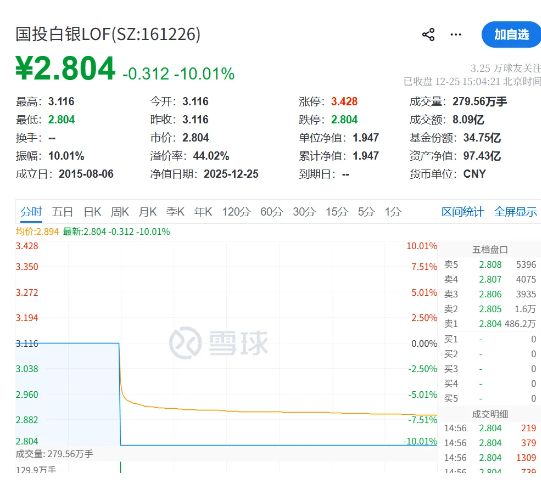 另外,國投白銀LOF發(fā)布公告稱,將于26日開盤起至10:30停牌后復牌,并警示二級市場交易價格存在明顯溢價風險。截至12月25日,該基金二級市場收盤價為2.804元,較12月24日的基金份額單位凈值1.9278元高出45%。