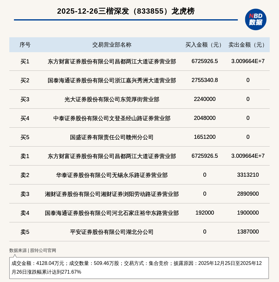 每經(jīng)訊,2025年12月26日,新三板創(chuàng)新層公司三楷深發(fā)(833855,收盤價(jià):13.38元)登上龍虎榜,交易方式是集合競(jìng)價(jià),披露原因是2025年12月25日至2025年12月26日漲跌幅累計(jì)達(dá)到271.67%,成交數(shù)量509.46萬(wàn)股,成交金額4128.04萬(wàn)元。買一席位為東方財(cái)富證券股份有限公司昌都兩江大道證券營(yíng)業(yè)部,買入672.59萬(wàn)元;賣一席位為東方財(cái)富證券股份有限公司昌都兩江大道證券營(yíng)業(yè)部,賣出3009.66萬(wàn)元。