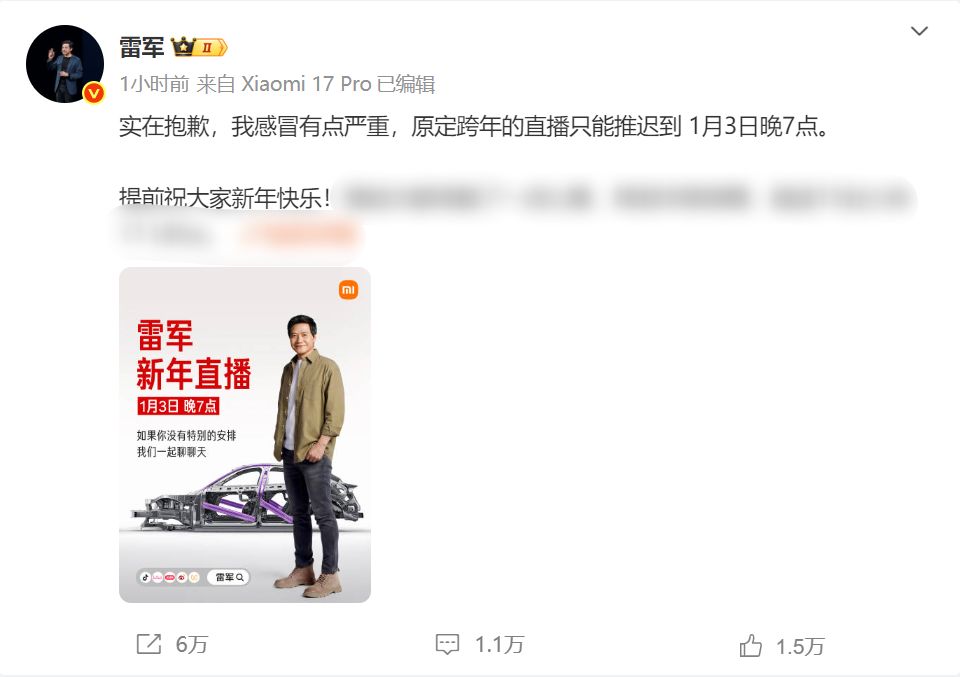 12月31日上午,小米集團(tuán)董事長雷軍發(fā)文稱,感冒有點(diǎn)嚴(yán)重,原定跨年的直播推遲到1月3日晚7點(diǎn)。