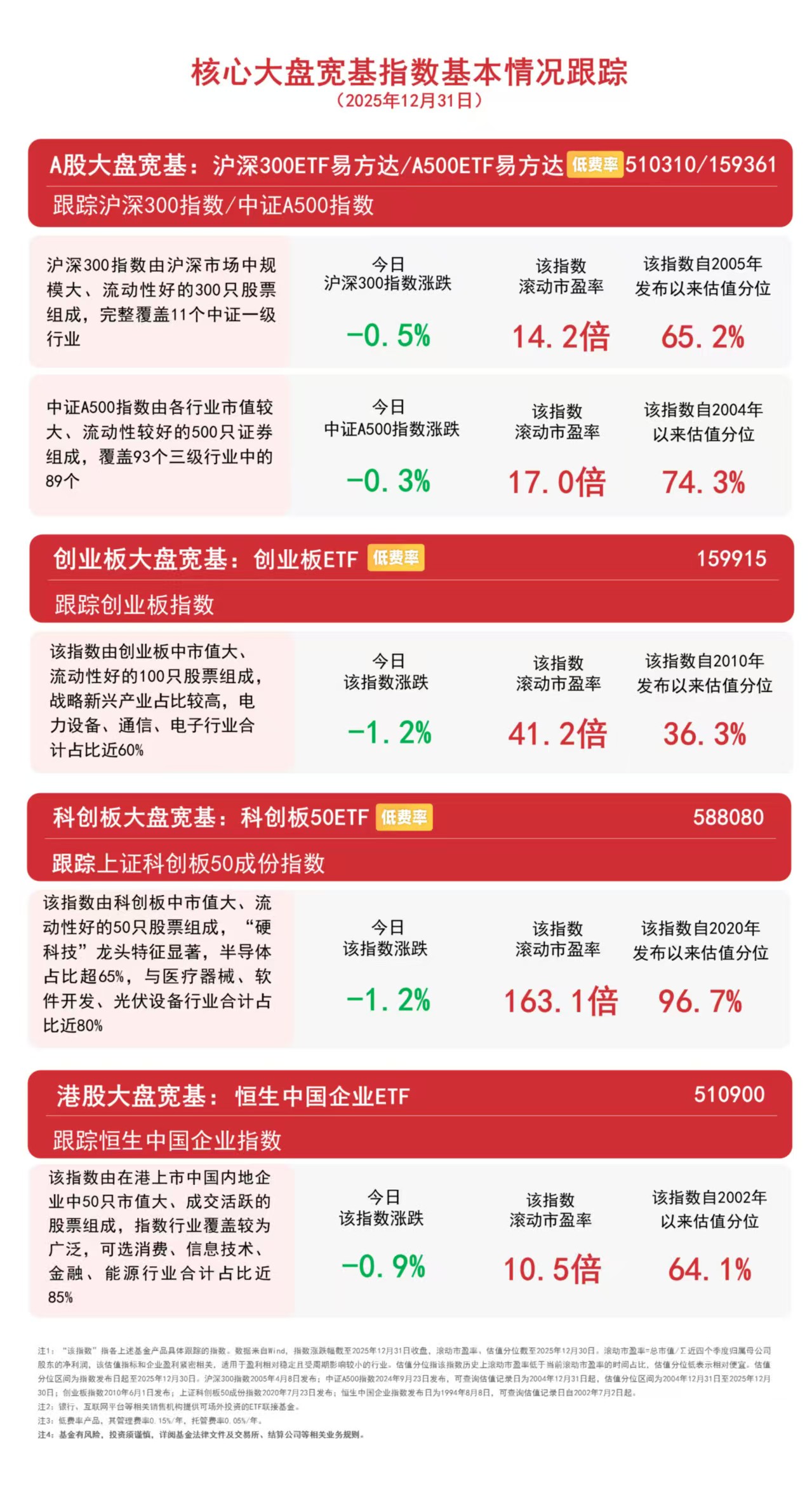 12月31日,A股三大指數(shù)漲跌不一,滬指微漲0.1%錄得11連陽,全市場成交額達(dá)2.07萬億元。板塊題材上,衛(wèi)星導(dǎo)航、商業(yè)航天、軍工板塊漲幅居前,CPO、GPU、光伏逆變器板塊跌幅居前;港股早盤回調(diào),軍工板塊逆勢上漲,醫(yī)藥股跌幅居前,午后休市。截至收盤,中證A500指數(shù)下跌0.3%,滬深300指數(shù)下跌0.5%,創(chuàng)業(yè)板指數(shù)下跌1.2%,上證科創(chuàng)板50成份指數(shù)下跌1.2%,恒生中國企業(yè)指數(shù)下跌0.9%。