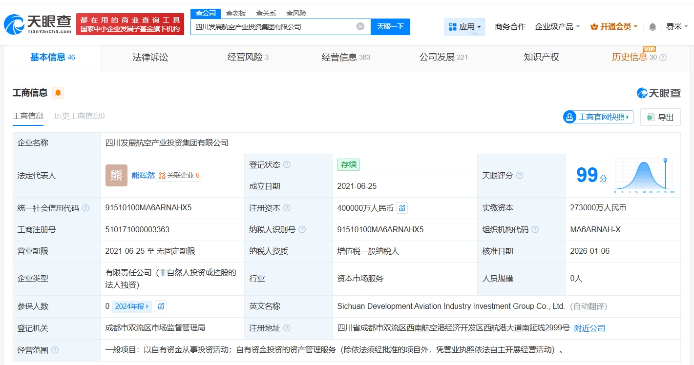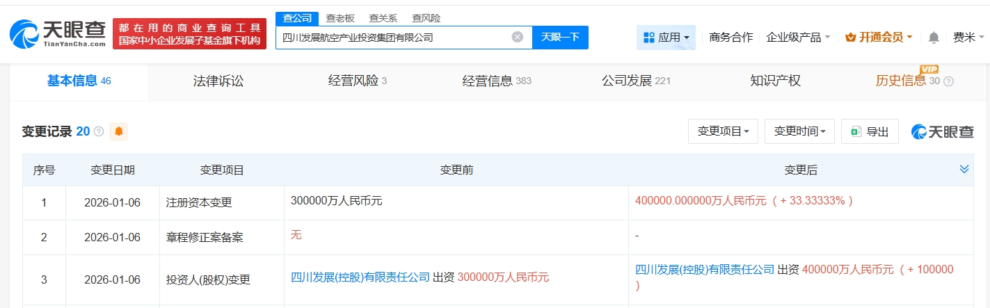每經(jīng)AI快訊,天眼查工商信息顯示,近日,四川發(fā)展航空產(chǎn)業(yè)投資集團(tuán)有限公司發(fā)生工商變更,注冊資本由30億元人民幣增至40億元人民幣,增幅約33%。四川發(fā)展航空產(chǎn)業(yè)投資集團(tuán)有限公司成立于2021年6月,法定代表人為熊輝然,經(jīng)營范圍為以自有資金從事投資活動(dòng)、自有資金投資的資產(chǎn)管理服務(wù)。股東信息顯示,該公司由四川發(fā)展(控股)有限責(zé)任公司全資持股。