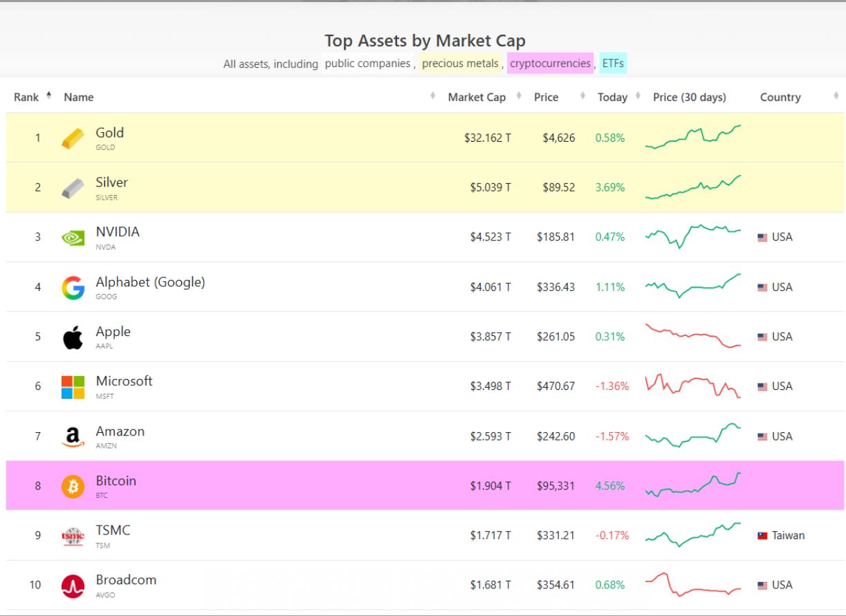 值得注意的是,受銀價提振,白銀總市值首次站上5萬億美元大關(guān),已超越英偉達成為全球第二大資產(chǎn)。根據(jù)市值數(shù)據(jù)平臺CompaniesMarketCap的數(shù)據(jù),目前白銀市值為5.039萬億美元;黃金以32.162萬億美元的市值位居榜首,芯片巨頭英偉達以4.523萬億美元的市值滑落至第三。前十名榜單如下: