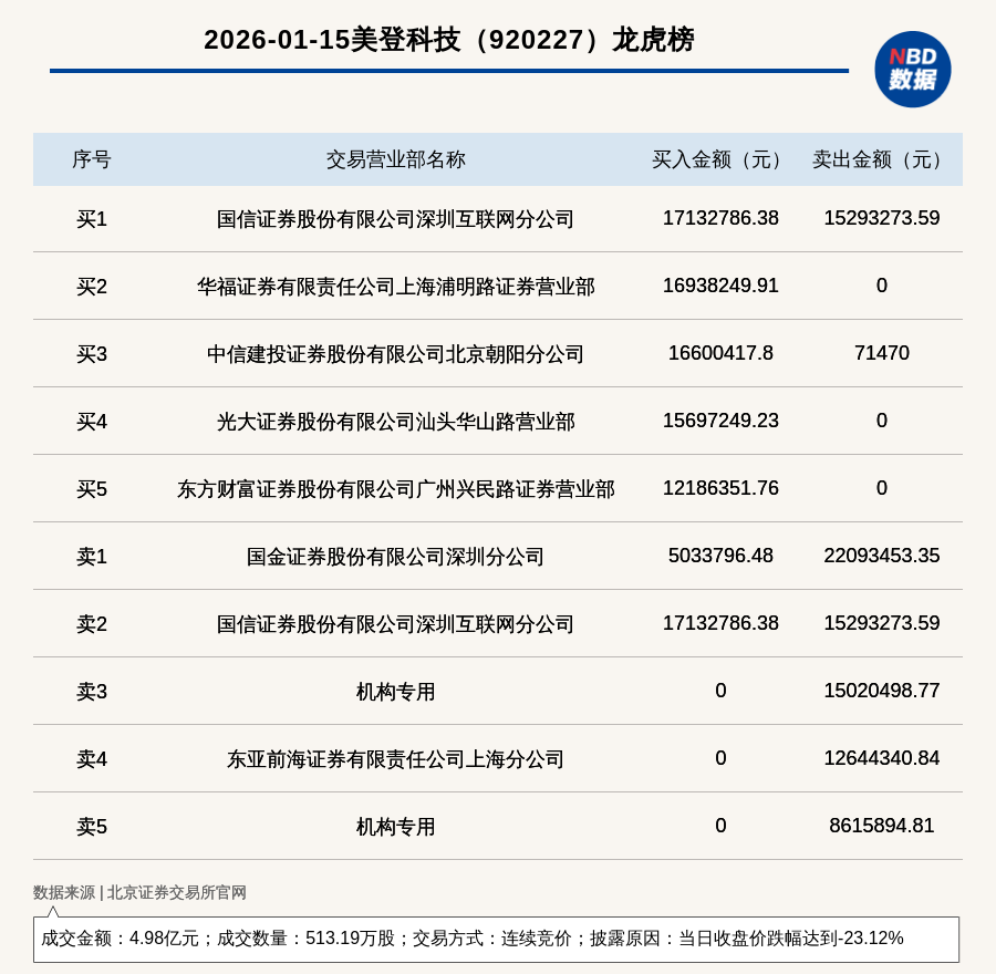 每經訊,2026年1月15日,北交所上市公司美登科技(920227,收盤價:89元)登上龍虎榜,交易方式是連續(xù)競價,披露原因是當日收盤價跌幅達到-23.12%,成交數量513.19萬股,成交金額4.98億元。買一席位為國信證券股份有限公司深圳互聯(lián)網分公司,買入1713.28萬元;賣一席位為國金證券股份有限公司深圳分公司,賣出2209.35萬元。