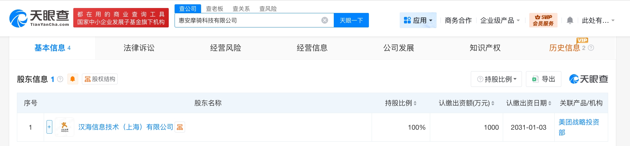 每經(jīng)AI快訊,天眼查工商信息顯示,近日,惠安摩騎科技有限公司成立,法定代表人為孫可青,注冊資本1000萬元人民幣,經(jīng)營范圍含網(wǎng)絡(luò)與信息安全軟件開發(fā)、信息技術(shù)咨詢服務(wù)、社會經(jīng)濟(jì)咨詢服務(wù)、互聯(lián)網(wǎng)數(shù)據(jù)服務(wù)、信息咨詢服務(wù)、企業(yè)管理咨詢、供應(yīng)鏈管理服務(wù)、共享自行車服務(wù)等。股東信息顯示,該公司由美團(tuán)旗下漢海信息技術(shù)(上海)有限公司全資持股。