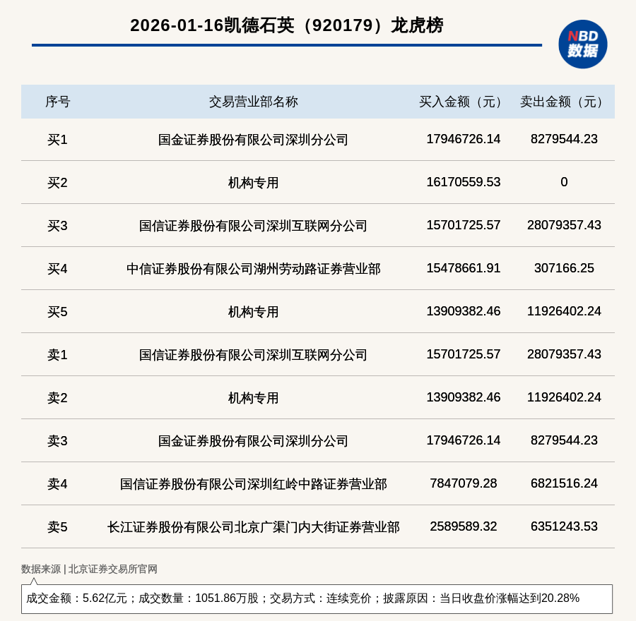 每經(jīng)訊,2026年1月16日,北交所上市公司凱德石英(920179,收盤價(jià):55.88元)登上龍虎榜,交易方式是連續(xù)競價(jià),披露原因是當(dāng)日收盤價(jià)漲幅達(dá)到20.28%,成交數(shù)量1051.86萬股,成交金額5.62億元。買一席位為國金證券股份有限公司深圳分公司,買入1794.67萬元;賣一席位為國信證券股份有限公司深圳互聯(lián)網(wǎng)分公司,賣出2807.94萬元。