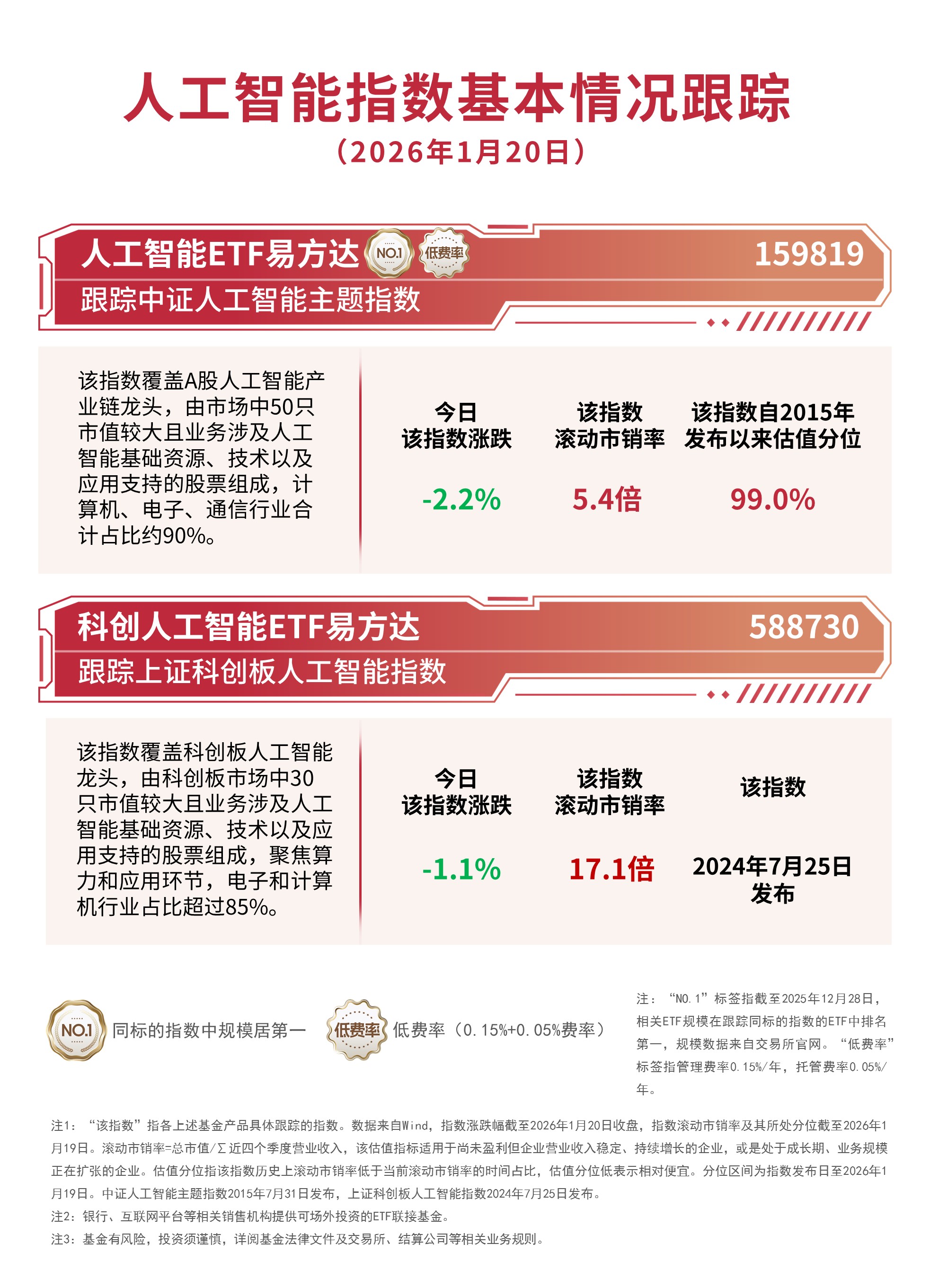 1月20日,AI產(chǎn)業(yè)鏈股集體回調(diào),芯片、半導體設(shè)備等AI硬件板塊跌幅相對較窄,截至收盤,中證人工智能主題指數(shù)下跌2.2%,上證科創(chuàng)板人工智能指數(shù)下跌1.1%,資金逆勢加倉,人工智能ETF易方達(159819)全天凈申購約1.6億份。