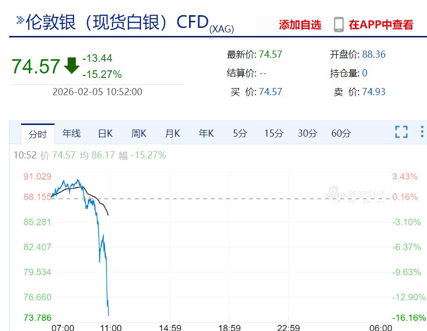 截至發(fā)稿,現(xiàn)貨白銀跌破80美元/盎司,日內(nèi)跌超15%。滬銀期貨主力合約日內(nèi)跌幅擴(kuò)大至15%,報19400元/千克。