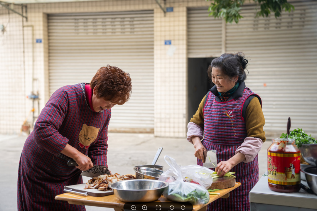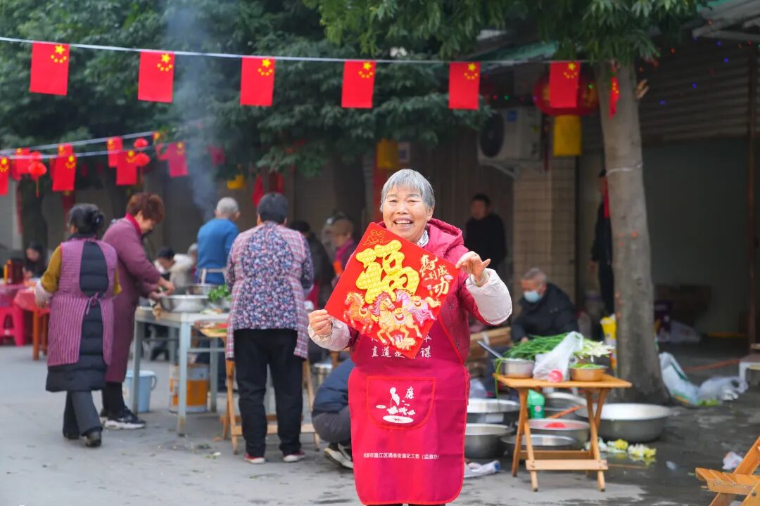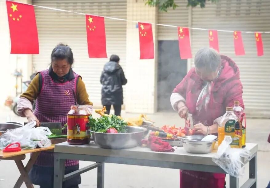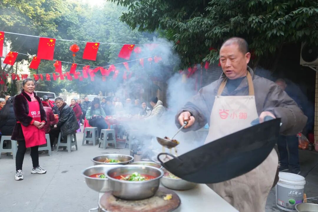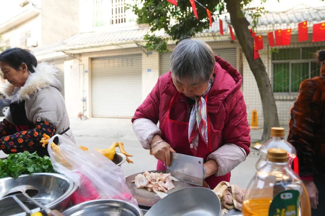 這不是誰家的廚房,而是涌泉街道共耕社區(qū)的一條街上,臨時搭起的“露天灶臺”。2月6日,臘月十九,社區(qū)居民宋秀華家門口的街道熱鬧起來,鍋碗瓢盆的碰撞聲、鄰里間的招呼聲、孩子們的笑鬧聲,交織成熱鬧而溫暖的景象。
