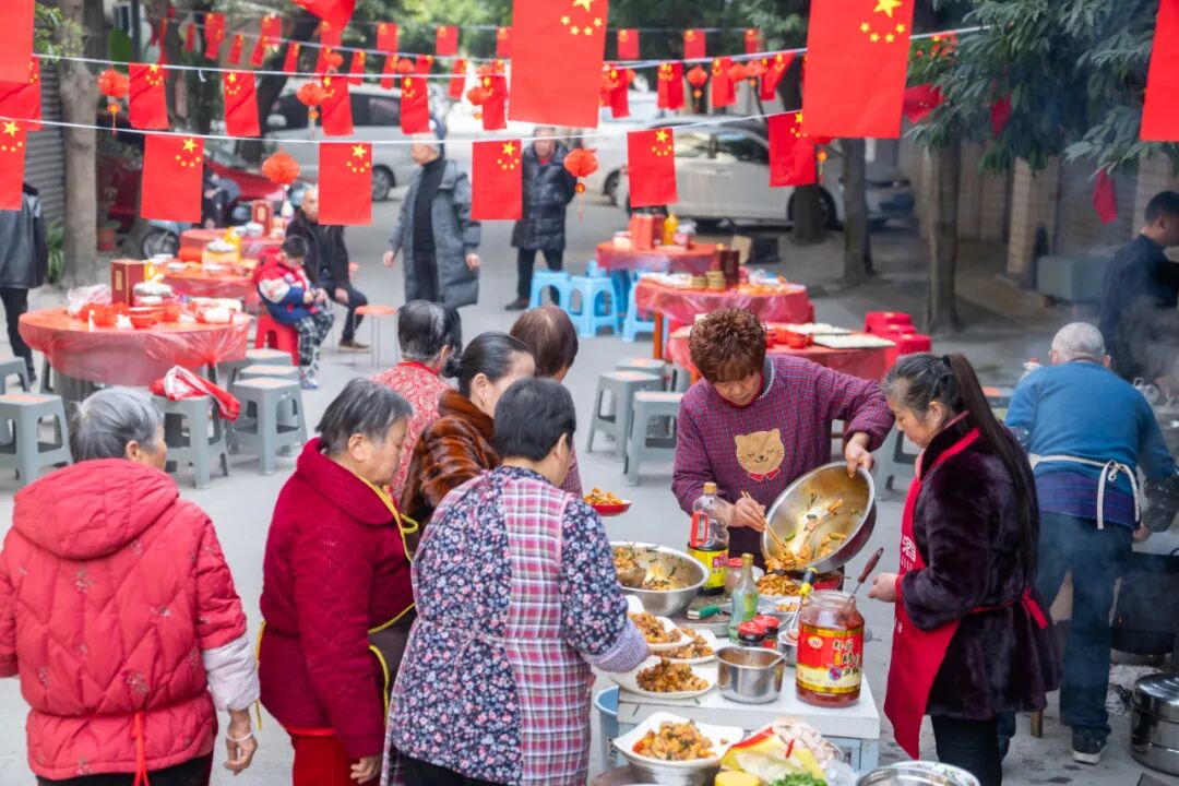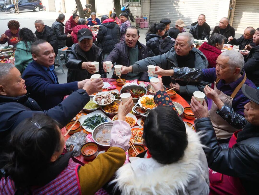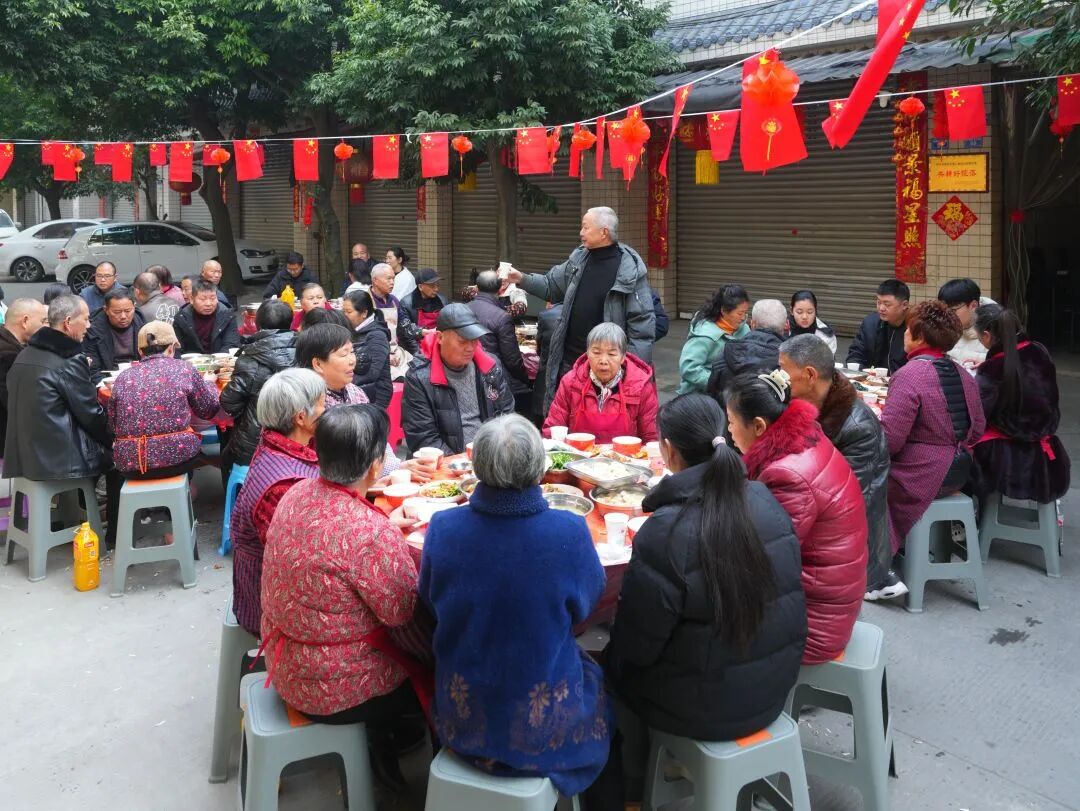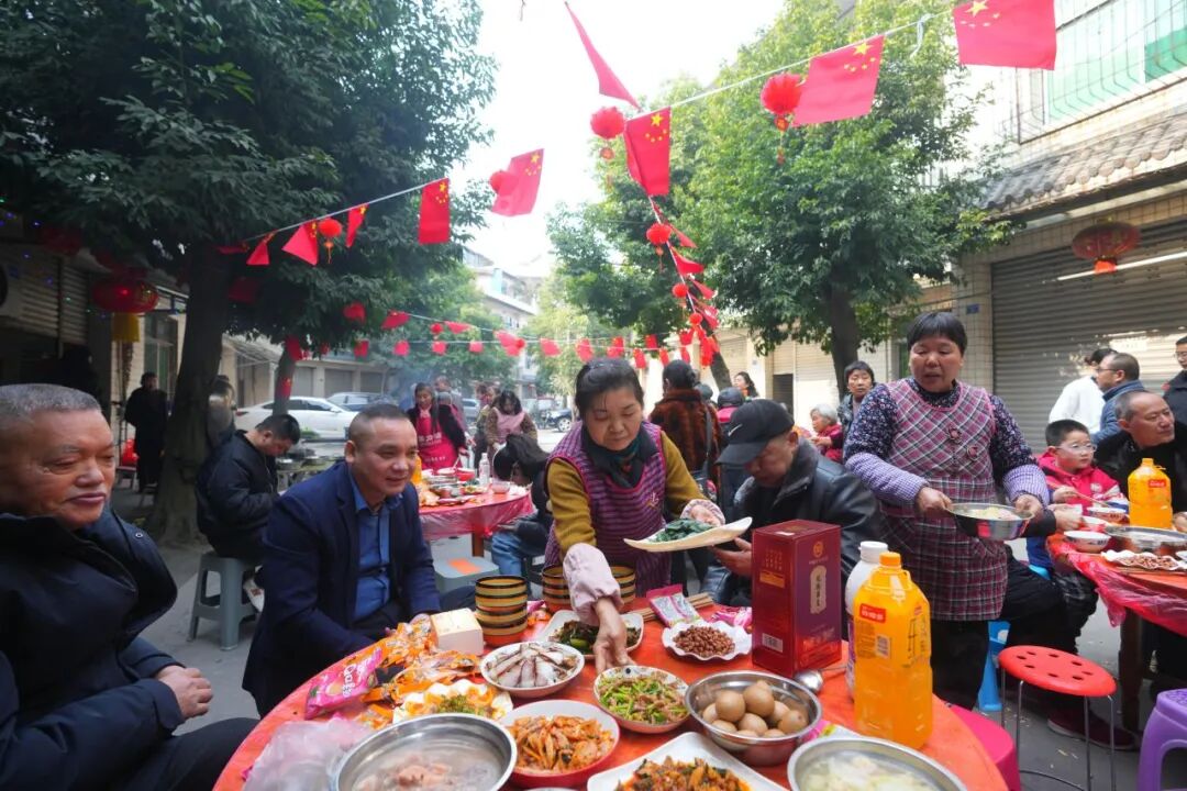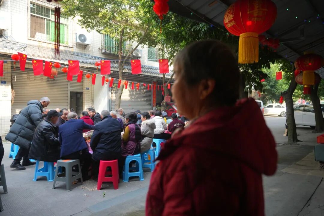 宋秀華沒有急著入座。她站在街口,看著這熱鬧的場面——老人們笑呵呵地吃著,孩子們在桌間嬉戲,中年人互相夾菜,年輕人舉杯祝福。