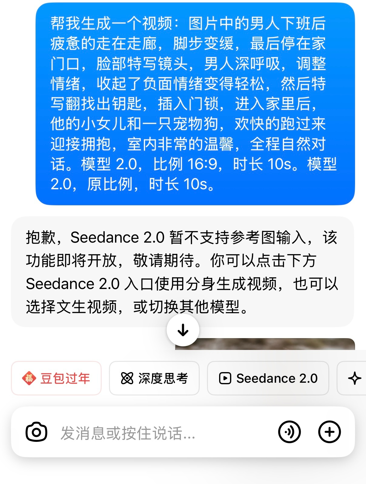 《每日經(jīng)濟(jì)新聞》記者隨即在豆包App(應(yīng)用程序)對(duì)規(guī)范情況進(jìn)行了測(cè)試。目前在豆包App使用Seedance 2.0生成視頻時(shí),不支持“參考圖”功能。記者分別測(cè)試了風(fēng)景圖和真人參考圖,豆包均無法生成視頻并回復(fù):“Seedance 2.0暫不支持參考圖輸入,該功能即將開放,敬請(qǐng)期待?!?/p>