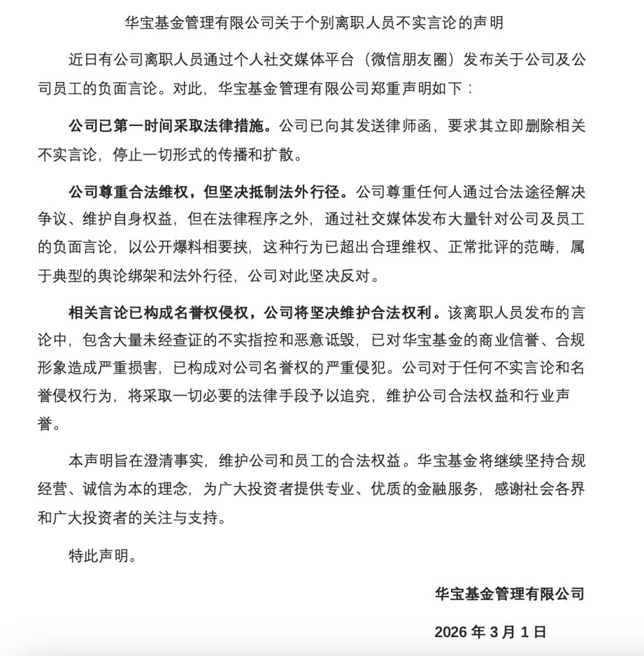 該聲明顯示,近日有公司離職人員通過個人社交媒體平臺(微信朋友圈)發(fā)布關(guān)于公司及公司員工的負面言論,華寶基金已第一時間采取法律措施,向其發(fā)送律師函,要求其立即刪除相關(guān)不實言論,停止一切形式的傳播和擴散。該公司尊重合法維權(quán),但堅決抵制法外行徑。