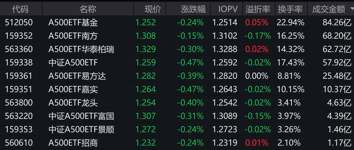 截至上午收盤(pán),場(chǎng)內(nèi)跟蹤中證A500指數(shù)的ETF小幅下跌。其中,有10只中證A500相關(guān)ETF成交額超1億元,2只超68億元。A500ETF基金、A500ETF南方早盤(pán)成交額分別為84.26億元、68.2億元。