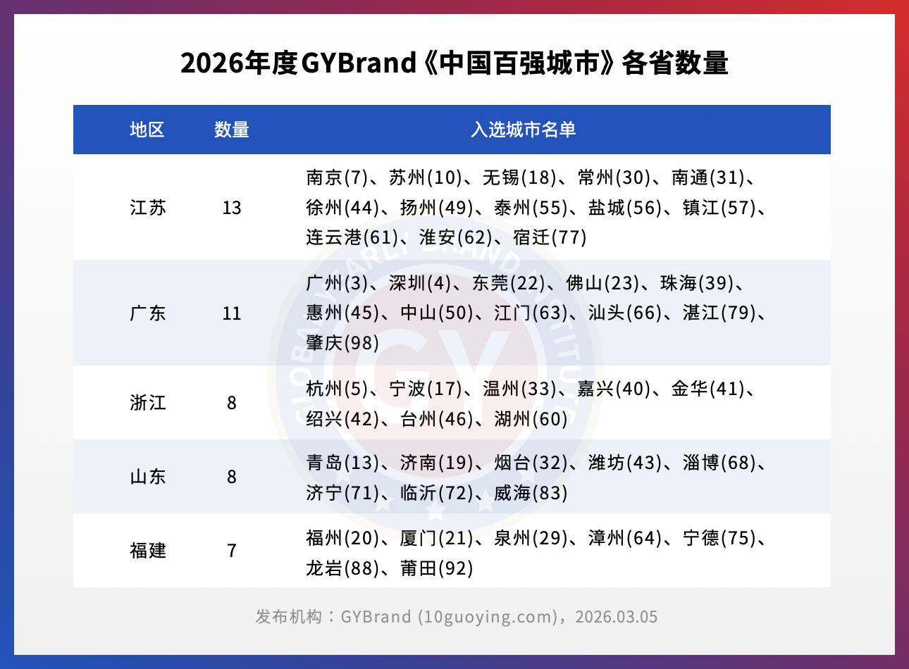 日前,GYBrand全球品牌研究院發(fā)布2026年度中國百強(qiáng)城市指數(shù)榜單。本年度中國十大城市排名依次為北京、上海、廣州、深圳、杭州、成都、南京、武漢、重慶、蘇州。其中長三角城市群占4席,珠三角城市群占2席,成渝城市群占2席,京津冀城市群和長江中游城市群各1席。