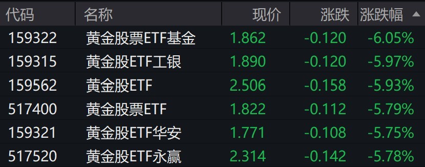 受盤面影響,黃金股相關ETF跌約6%。