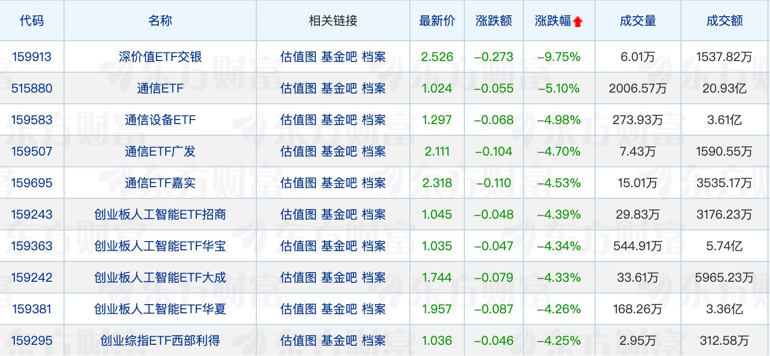 下跌方面,深價(jià)值ETF交銀領(lǐng)跌9.75%,通信ETF、創(chuàng)業(yè)板人工智能ETF悉數(shù)回調(diào)。