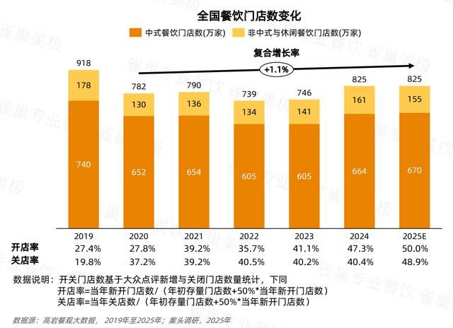 《2026中國(guó)中式餐飲白皮書(shū)》預(yù)計(jì),2025年,全國(guó)餐飲門店數(shù)約825萬(wàn)家,關(guān)店率從2022年的35.7%升至48.9%。同時(shí),開(kāi)店率也在持續(xù)攀升,預(yù)計(jì)2025年達(dá)到50%,創(chuàng)下新高。