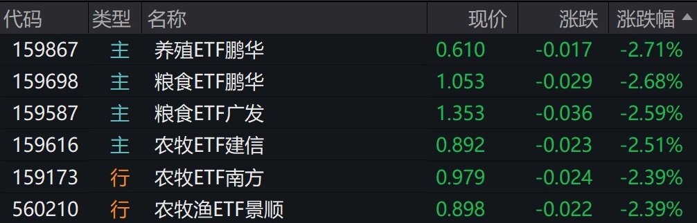 受盤面影響,養(yǎng)殖、糧食、農(nóng)牧相關(guān)ETF跌超2%。