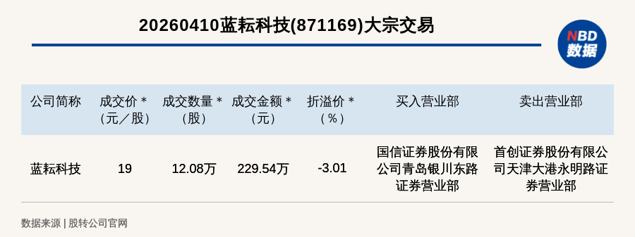 每經(jīng)訊,2026年4月10日,新三板創(chuàng)新層公司藍(lán)耘科技(871169,收盤價(jià):19.59元)發(fā)生一筆大宗交易,成交價(jià)19元/股,成交數(shù)量12.08萬股,成交金額229.54萬元,折價(jià)3.01%。買入營業(yè)部是國信證券股份有限公司青島銀川東路證券營業(yè)部,賣出營業(yè)部是首創(chuàng)證券股份有限公司天津大港永明路證券營業(yè)部。