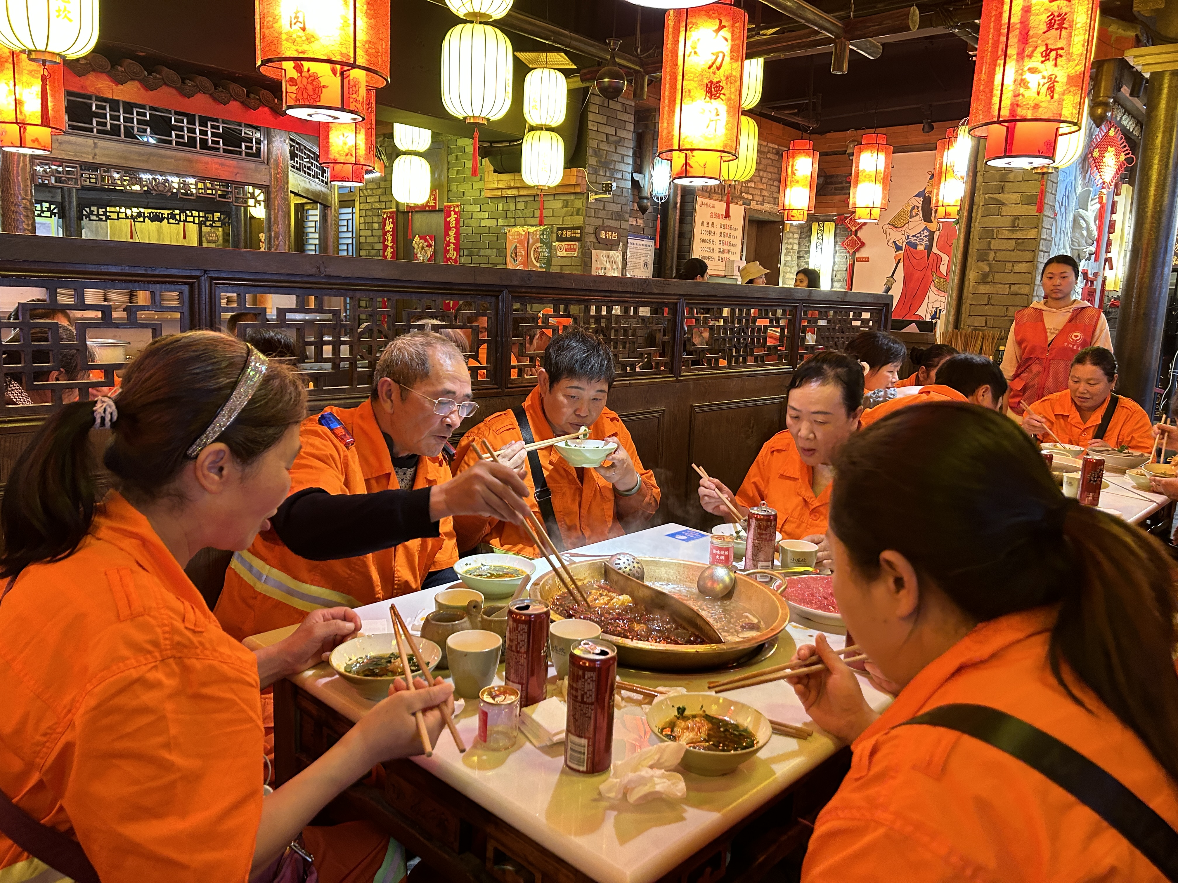 紅油鍋底咕嘟冒著泡,牛油香直往鼻子里鉆。環(huán)衛(wèi)工李秀英一進門,工友王曉莉就在靠里的位置沖她招手。